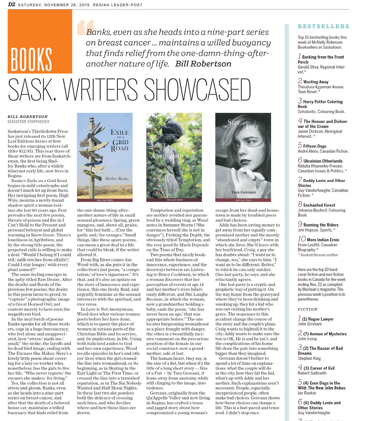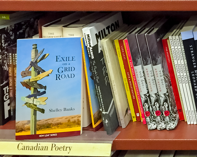 While we were in Saskatoon, we dropped by the publisher’s — Thistledown Press — and what a delight to see copies of my book, Exile on a Grid Road, in the window! (Thanks Jackie, Al and Stephanie!)