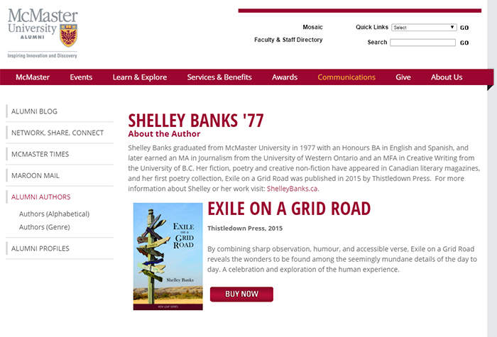 Screenshot of McMaster Alumni webpage featuring my book, Exile on a Grid Road.