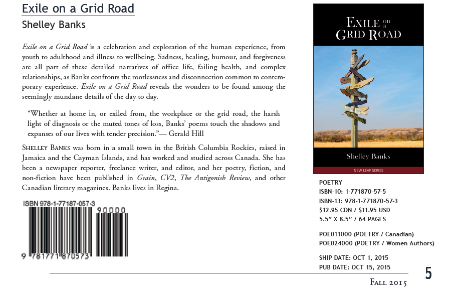 Exile on a Grid Road is part of the Thistledown Press 2015 New Leaf Series, which features work by four writers: