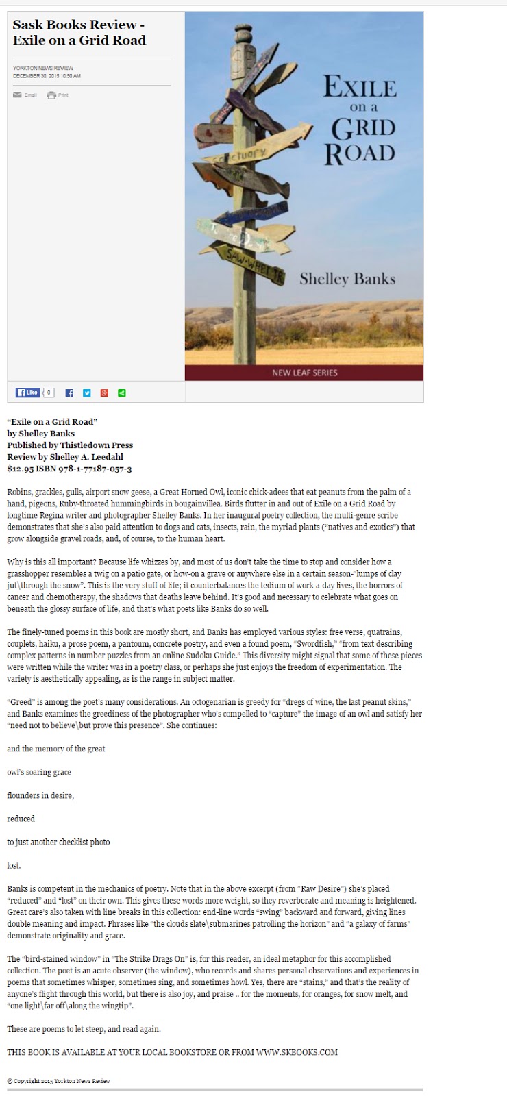 That was exciting — to wake up to see a long review of my poetry collection, Exile on a Grid Road, featured in today’s Regina LeaderPost and Saskatoon StarPhoenix, along with reviews of Jan Wood’s Love is not Anonymous and Tara Gereaux’s Size of a Fist!